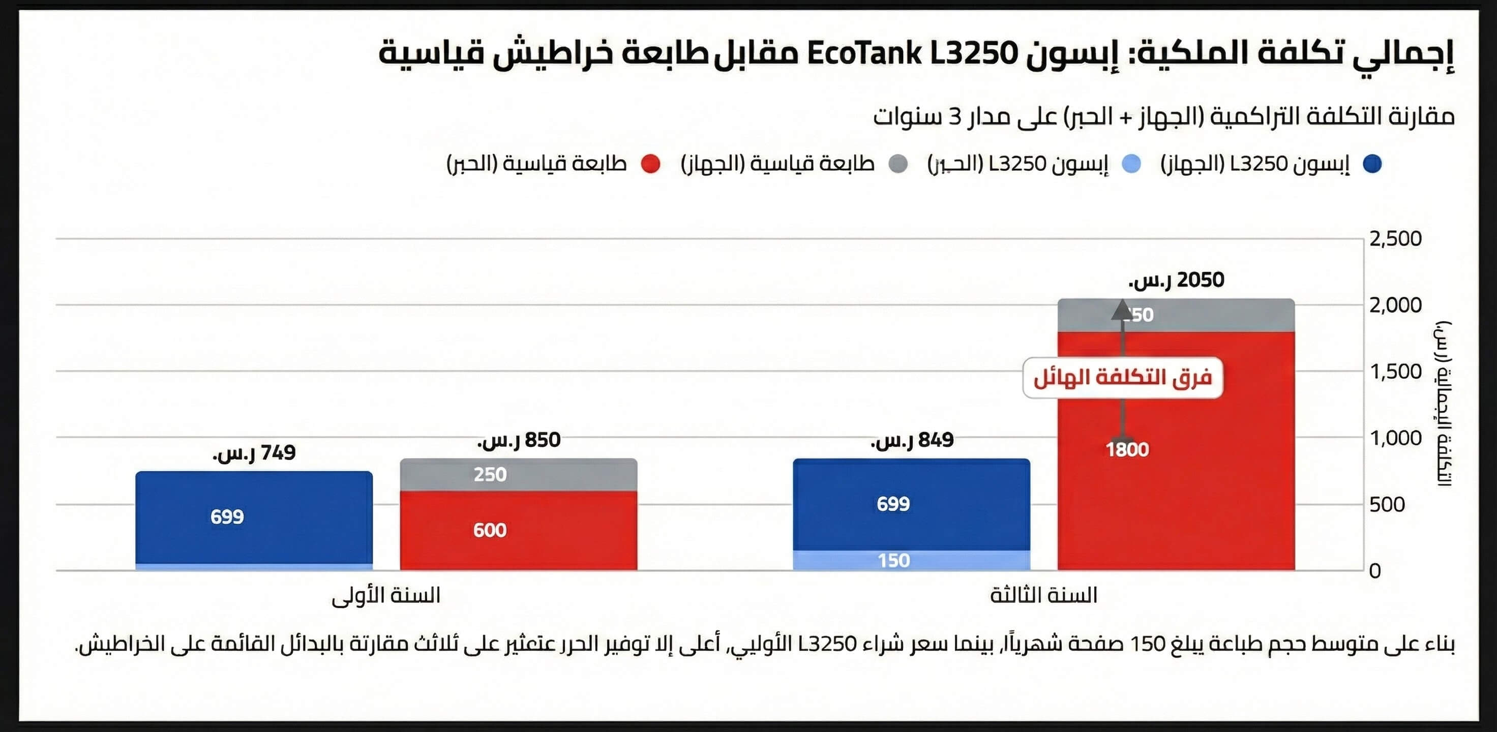 لاحظ الفرق في التوفير مع هذه الطابعة مقارنة بأي طابعة خراطيش أو ليزر، فالنتيجة واضحة جداً.