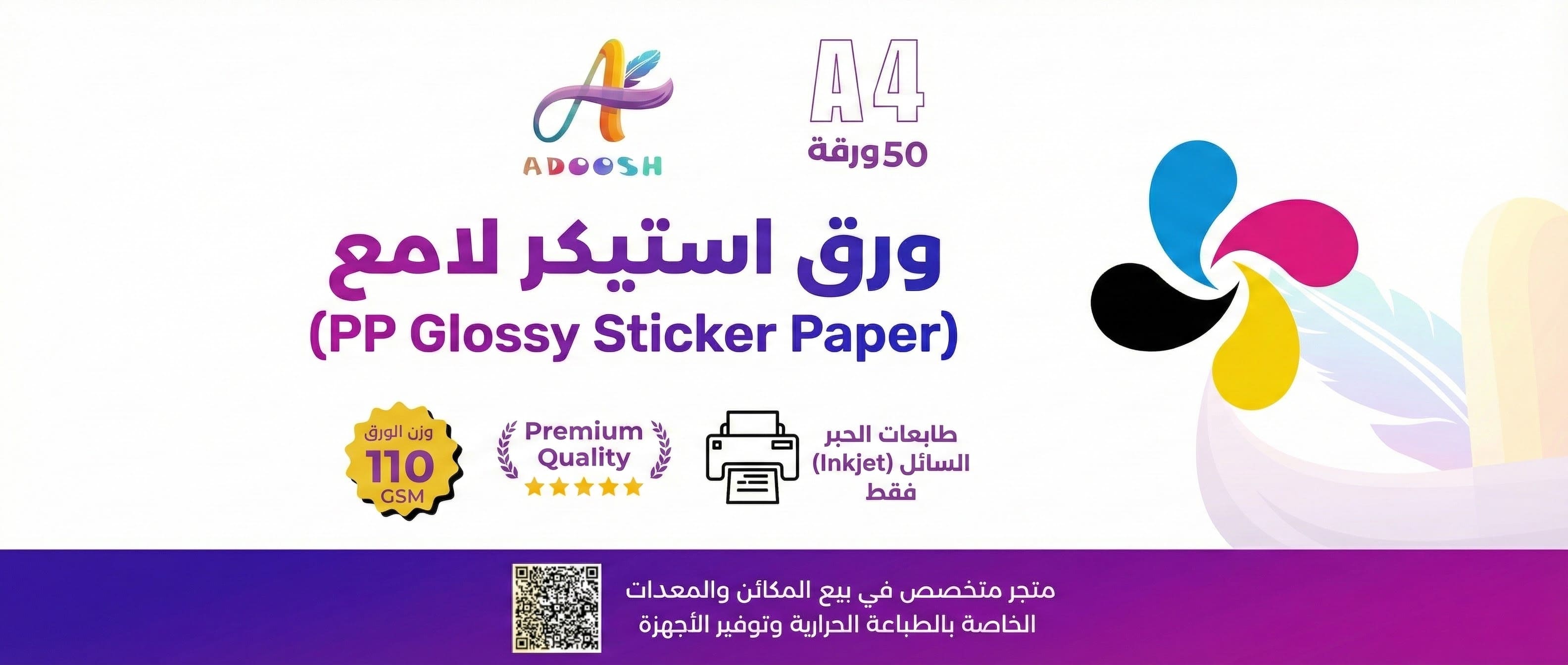 هل تبحث عن استيكرات تبرز جمال تصاميمك وألوانها؟ نقدم لك ورق استيكر أدوش (ADOOSH) اللامع، المصنوع من مادة PP (بولي بروبلين) المتينة. هذا الورق ليس مجرد لاصق عادي، بل هو خيارك الأمثل لطباعة ملصقات بجودة فوتوغرافية عالية ولمعان زجاجي يخطف الأنظار، مباشرة من طابعتك المنزلية.
